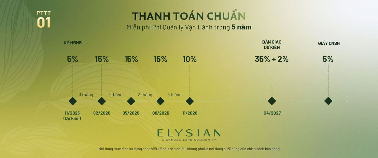 Được bảo chứng bởi chứng chỉ xanh LOTUS, Elysian cam kết tiết kiệm 16,53% năng lượng và 50,2% lượng nước tiêu thụ, mang lại giá trị bền vững. Với mức giá khởi điểm từ 3,9 tỷ đồng cùng chính sách thanh toán chỉ 5% để ký hợp đồng mua bán , Elysian là lựa chọn đầu tư thông minh và là nơi an cư lý tưởng cho những ai tìm kiếm một phong cách sống khác biệt.