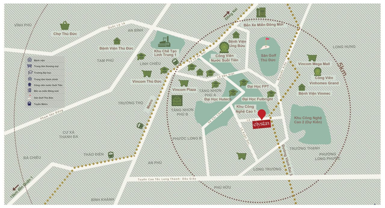 - Tuyến đường sắt nhẹ Thủ Thiêm – Sân bay Long Thành: Nhìn về tương lai xa hơn, dự án đường sắt nhẹ kết nối trực tiếp từ trung tâm tài chính mới Thủ Thiêm đến Sân bay Quốc tế Long Thành đang được xúc tiến. Tuyến đường sắt này được quy hoạch chạy song song với cao tốc TP.HCM – Long Thành – Dầu Giây, hứa hẹn sẽ tạo ra một phương thức di chuyển cao cấp, hiện đại và hiệu quả. Vị trí của Elysian gần với trục kết nối này sẽ là một lợi thế cực lớn trong tương lai.
